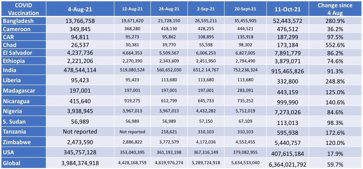 Globally, over 6.3 billion doses of Covid vaccines have been administered as of October 11, which is a 60% increase during the past 9 weeks.